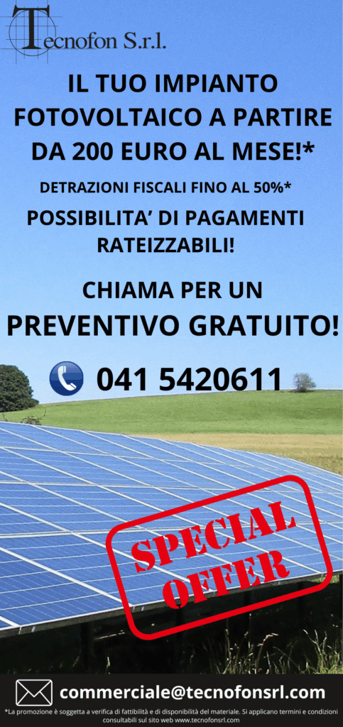 L’importo di €200,00 al mese riportato nella comunicazione cartacea e digitale di Tecnofon S.r.l. è da considerarsi esempio indicativo calcolato su di un impianto fotovoltaico da 3kWp completo di inverter ibrido, sistema di accumulo, cablaggi ed installazione su tetto rateizzato in 60 rate mensili a tasso zero.